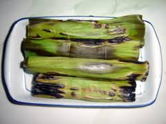 3. Ambil 1-2 sdm adonan, gulung dengan selembar daun pisang, semat ujung2nya, panggang diatas bara api/ dalam oven dengan api atas sampai matang.